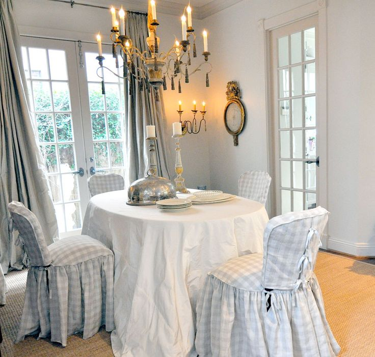 Slightly softer pastel colors suit many homes. Here they have resorted to gray silk curtains in the windows and a tablecloth in white dupion. It is difficult to have silk on a dining table because silk requires dry cleaning. .